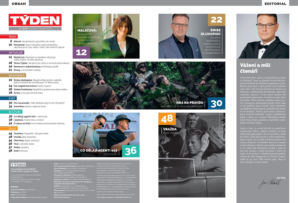 TÝDEN číslo 7/2025 k zakoupení ve vašich trafikách do 15. dubna. Časopis TÝDEN si můžete zakoupit i v elektronické verzi na digiport.cz