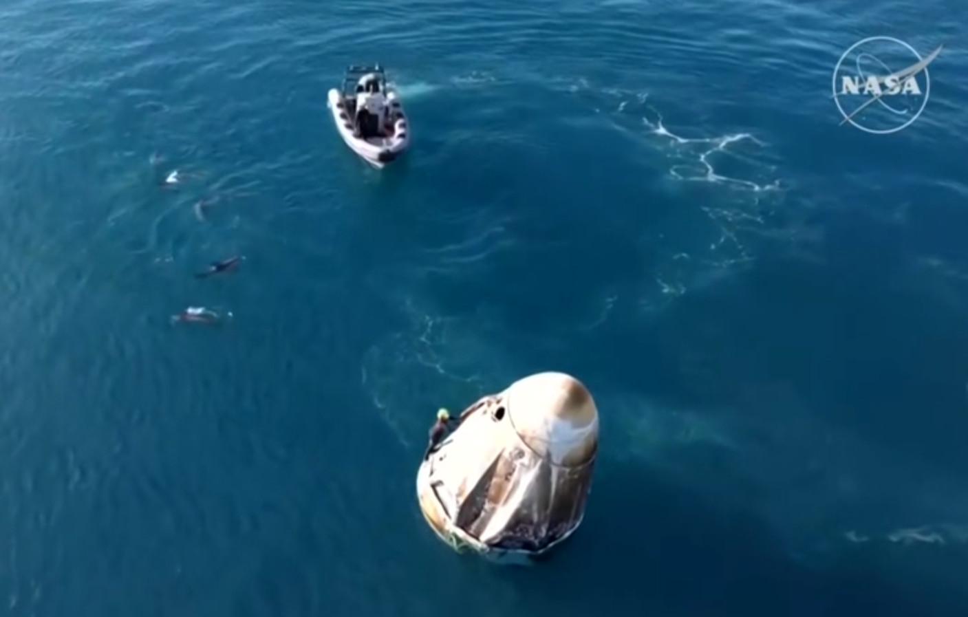 V modulu Crew Dragon od společnosti SpaceX byla i dvojice amerických astronautů, která uvázla na ISS na více než devět měsíců. Na videu je vidět modul pohupující se na hladině a týmy, které v lodích připluly astronauty vyzvednout. V těsné blízkosti přitom plave skupina delfínů.
