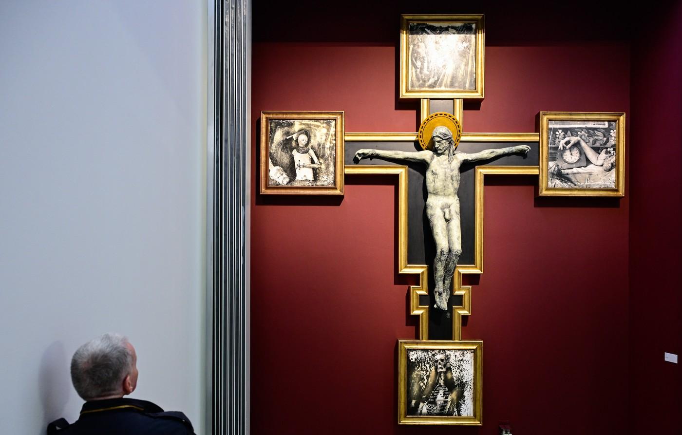 Přicházející návštěvníky upoutá kompozice ukřižovaného Krista bez bederní roušky v nadživotní velikostí, ramena kříže doplňují čtyři obrazy. Jedná se o jednu ze dvou Witkinových fotosoch. Druhou je Sfinga, vytvořená jako fotografie na olovu a domodelovaná sádrou.
