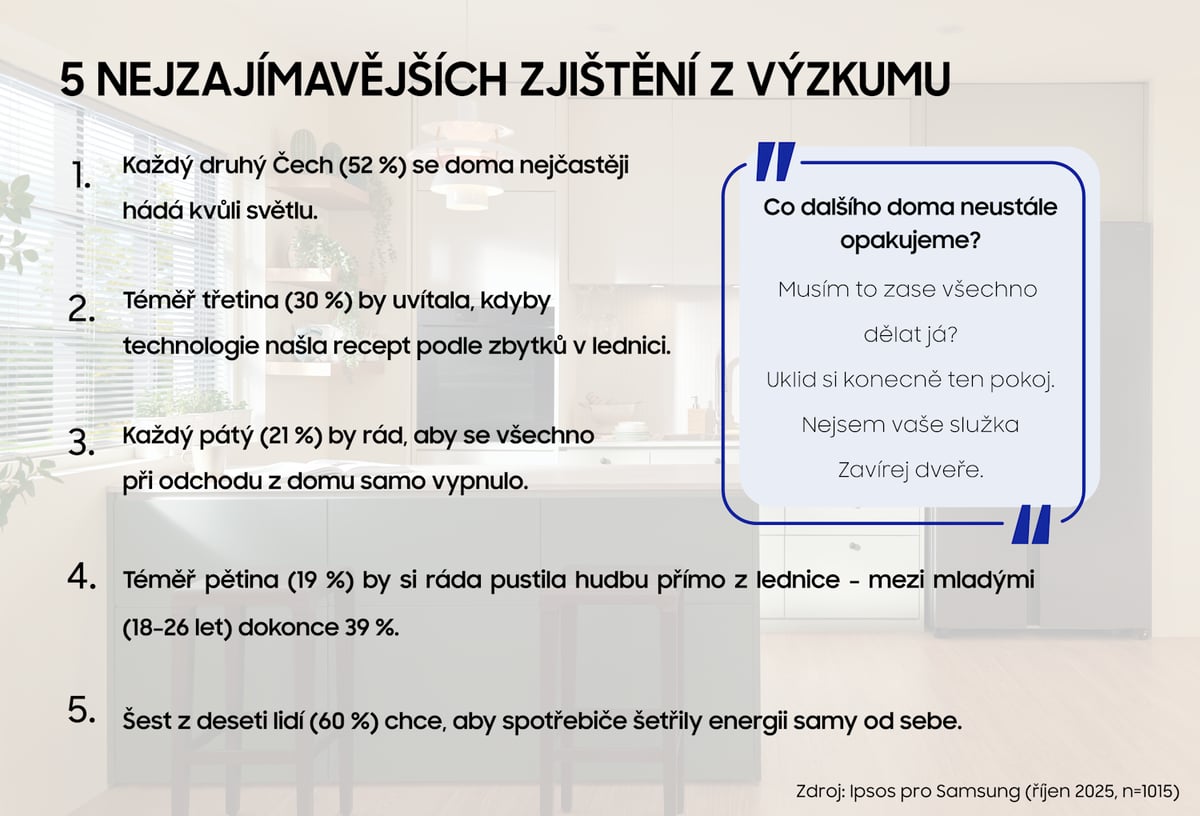 Češi se začínají učit novému typu domácí pohody. Nejde o to, aby se kuchyň proměnila v laboratoř umělé inteligence, ale aby doma všechno dávalo trochu větší smysl. Znáte pojem neviditelná zátěž? Naším cílem je hledat čím dál víc takových řešení, abychom nemuseli na všechno bez přestání myslet. Ukazuje to výzkum.