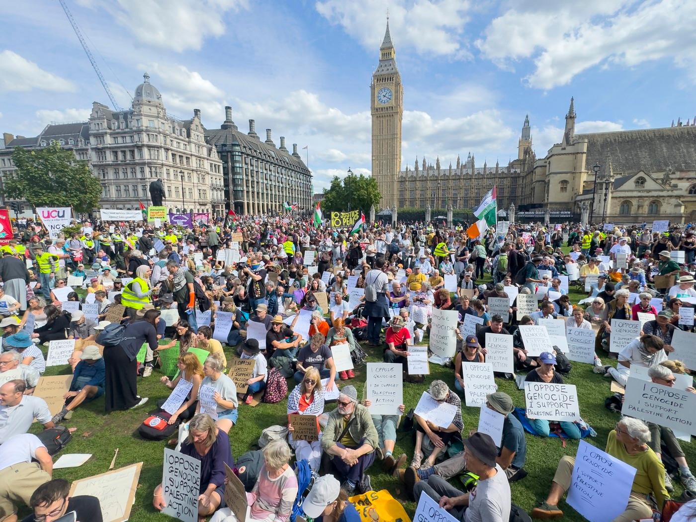 Stovky demonstrantů se dnes shromáždily nedaleko britského parlamentu v centrálním Londýně na protest proti zákazu organizace. Řada účastníků nesla transparenty, na nichž stálo "Jsem proti genocidě, podporuji Palestine Action".