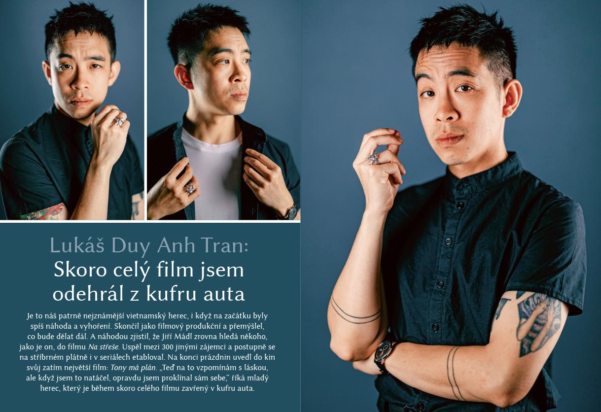 Je to náš patrně nejznámější vietnamský herec, i když na začátku byly spíš náhoda a vyhoření. Skončil jako filmový produkční a přemýšlel, co bude dělat dál. A náhodou zjistil, že Jiří Mádl zrovna hledá někoho, jako je on, do filmu Na střeše. Uspěl mezi 300 jinými zájemci a postupně se na stříbrném plátně i v seriálech etabloval. Na konci prázdnin uvedl do kin svůj zatím největší film: Tony má plán. „Teď na to vzpomínám s láskou, ale když jsem to natáčel, opravdu jsem proklínal sám sebe,“ říká Lukáš Duy Anh Tran, který je během skoro celého filmu zavřený v kufru auta.