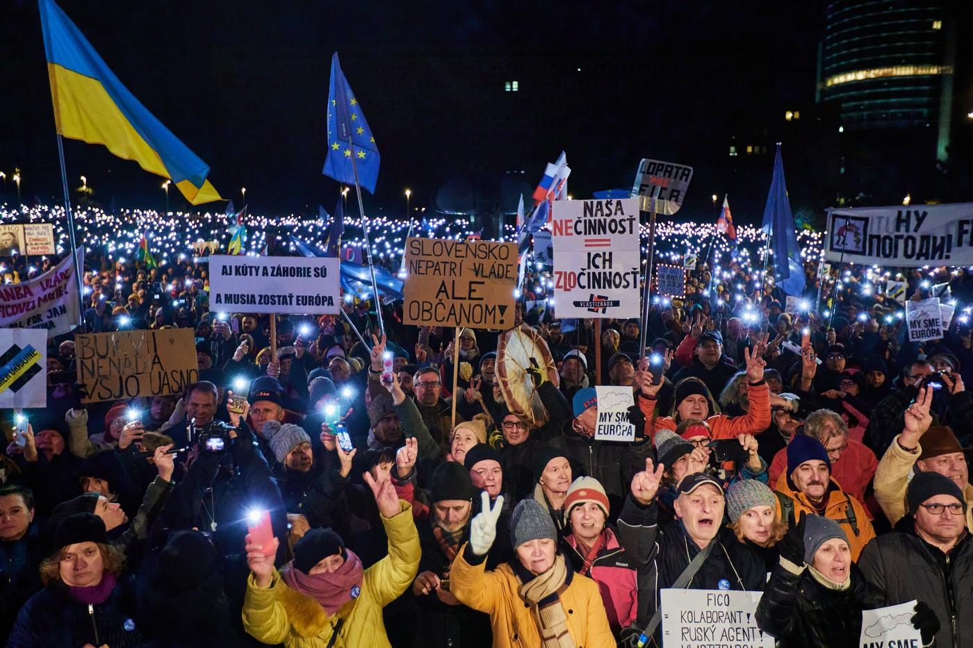 Například před dvěma týdny na shromáždění v Bratislavě zaznělo, že nezávislost a demokratické hodnoty Slovenska jsou pod tlakem vládní koalice a že země ztrácí jistotu evropské perspektivy. Demonstranty tehdy z pódia podpořil kromě jiných český herec Ivan Trojan, který v proslovu varoval před dopady případného vítězství Ruska ve válce na Ukrajině.