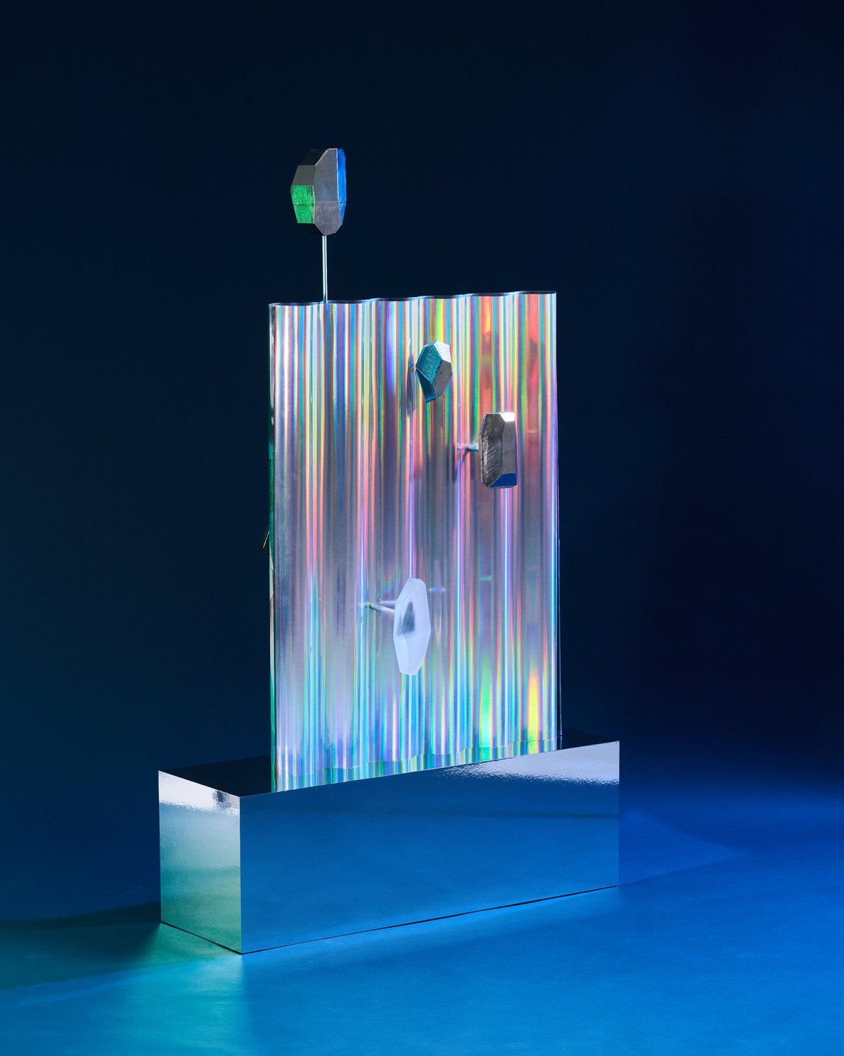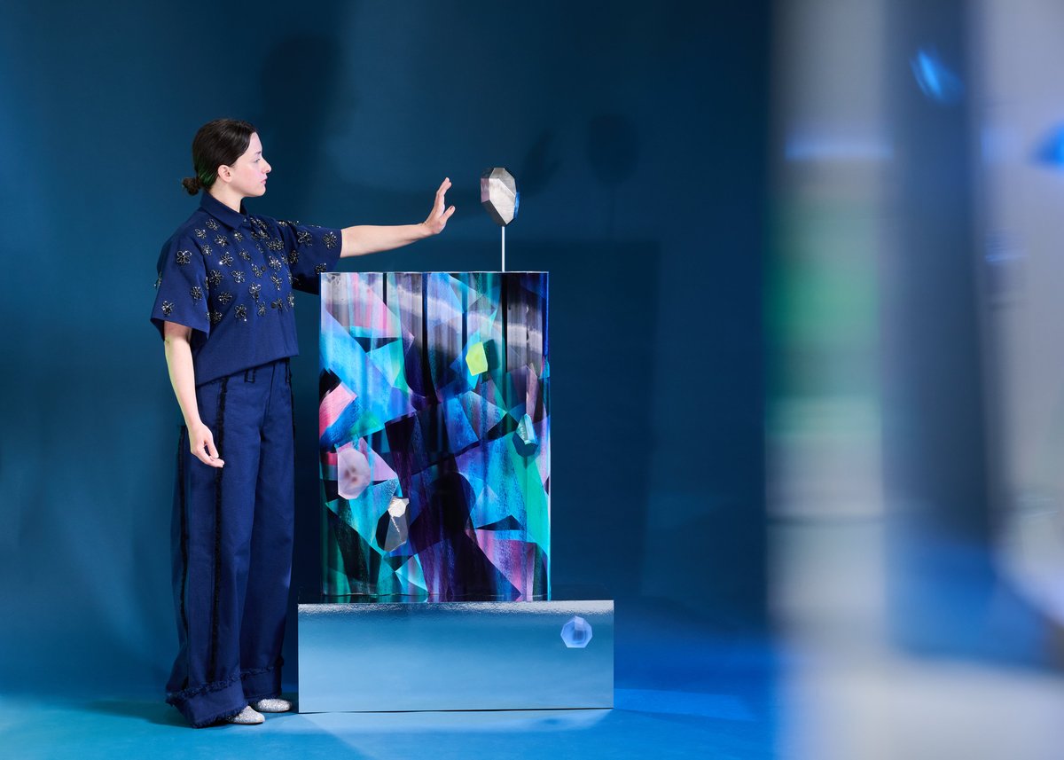 Při vzniku díla si autorka vytvořila vlastní tisk, jehož barevnost byla inspirovaná barvami nového zařízení. Z něj pak vznikla grafika převedená do geometrické podoby odlesků krystalů. „Oba motivy jsem zpracovala lentikulárním tiskem, který vytváří vizuální efekt přeměny a umožňuje vidět rozličné obrazy v závislosti na úhlu pohledu,“ vysvětluje návrhářka. Když Tereza hledala způsob, jak své dílo posunout dál, rozhodla se obohatit ho o krystaly, které volně navazují na motiv a dodávají instalaci další rozměr a odlesky. Některé z nich nechala precizně vybrousit ze skla, do výroby dalších zapojila moderní technologii 3D tisku a finální podobu završila pokovením, čímž krystaly získaly jedinečný charakter. Celá koláž je zasazena do vlnité stěny a mění charakter lentikulárního tisku, který je běžně užíván na rovné ploše, do více překvapivého vizuálního zážitku. Dílo, které je oslavou změny perspektivy, odráží myšlenku, že neexistuje jediný způsob, jak interpretovat svět kolem nás. Jde o objekt, jenž propojuje eleganci, experiment a neustálou hru pohledů.