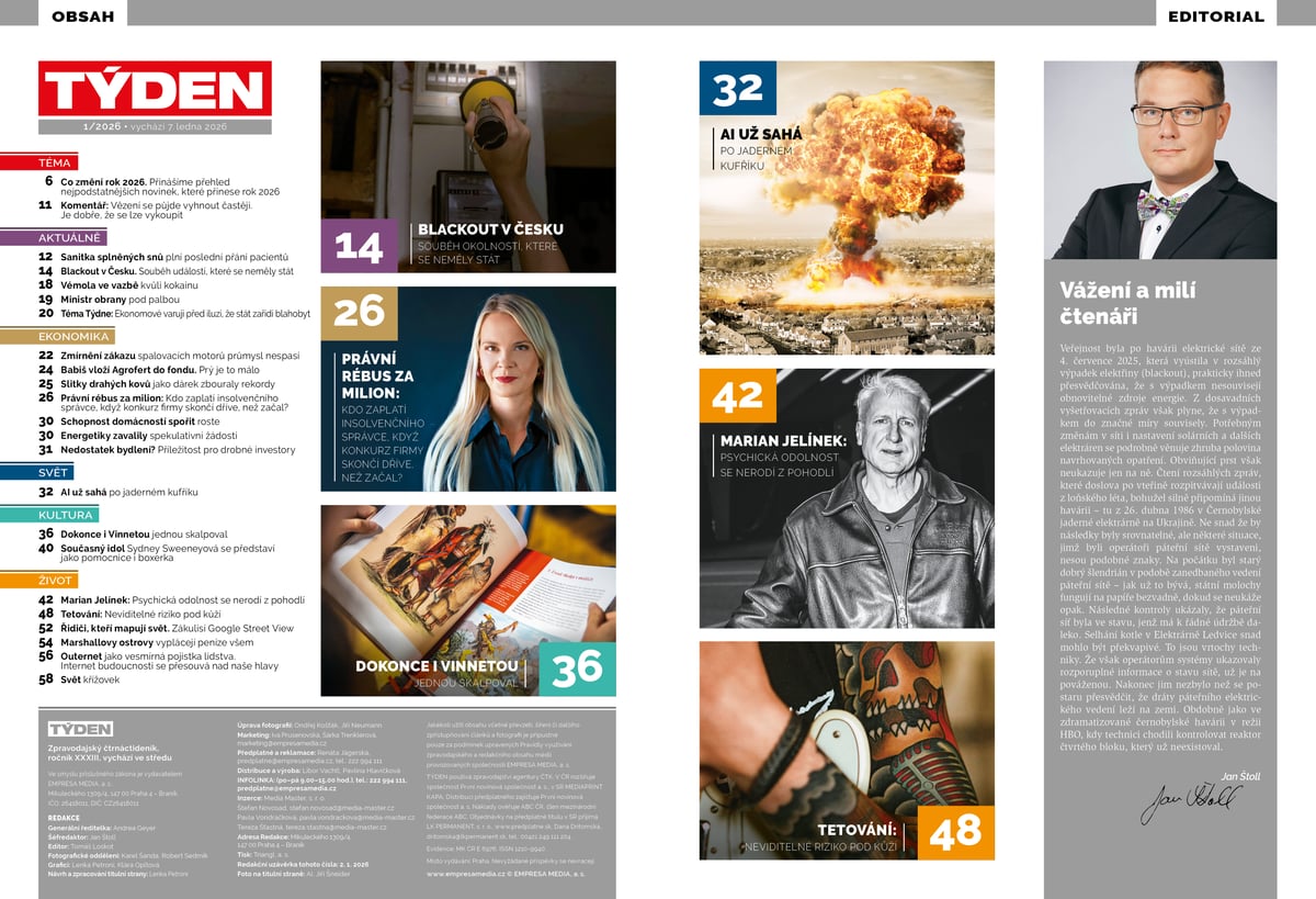 TÝDEN číslo 1/2026 k zakoupení ve vašich trafikách do 20. ledna. Časopis TÝDEN si můžete zakoupit i v elektronické verzi na digiport.cz