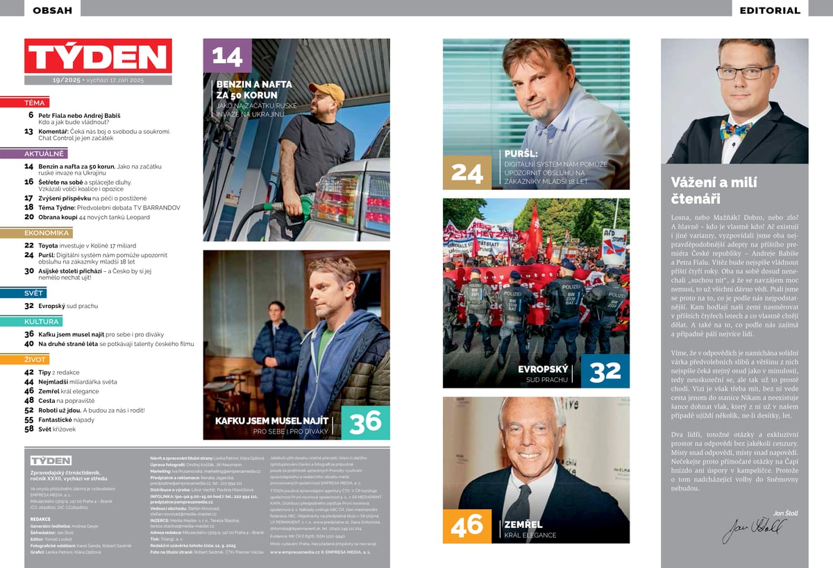 TÝDEN číslo 19/2025 k zakoupení ve vašich trafikách do 30. září. Časopis TÝDEN si můžete zakoupit i v elektronické verzi na digiport.cz