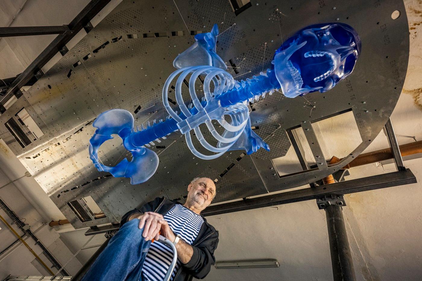 Obřího skleněného kostlivce vyrobili skláři Studia Lhotský v Železném Brodě na Jablonecku pro pražský obchodní dům Máj. Přes pět metrů dlouhou a 800 kilogramů vážící plastiku z modrého skla zavěsí na tenká ocelová lanka nad bar. Na její výrobě pracovali skláři deset měsíců, jen na utavení a zchlazení obrovské lebky vážící 200 kilogramů potřebovali dva měsíce. Novinářům to dnes řekl majitel studia, výtvarník Zdeněk Lhotský.