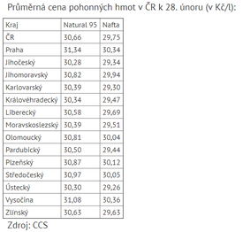 Za benzin motoristé nadále nejvíce zaplatí v Praze, kde je průměrná cena 31,34 Kč/l. Nad 31 korunami se drží ještě na Vysočině. Tam je stejně jako před týdnem nejdražší nafta s průměrnou cenou 30,36 Kč/l. Nejméně stojí benzin v Jihočeském kraji, litr průměrně 30,28 koruny. Nafta zůstala nejlevnější v Ústeckém kraji s průměrnou cenou 29,26 Kč/l.