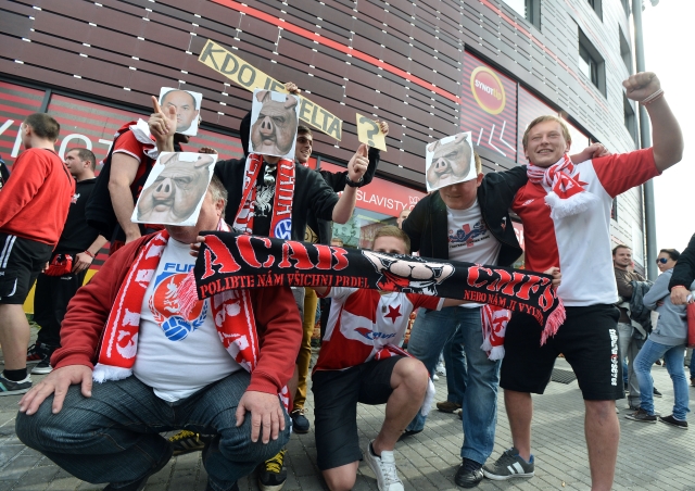 Fanoušci seskupení v pruhu před stadionem Slavie drželi dlouhý transparent v barvách klubu s nápisem Kvůli tomuhle tekla krev vašich dětí. Někteří měli přes obličej papírovou masku s vepří hlavou nebo fotografií šéfa Fotbalové asociace Miroslava Pelty. Skandovali mimo jiné "Pyrotechnika není zločin" a zapálili několik pochodní typu takzvaného bengálského ohně.