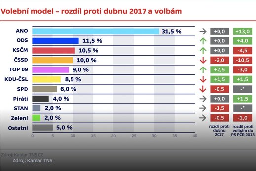 Hnutí ANO dosáhlo v květnovém průzkumu stejného výsledku jako v dubnu. Stagnovali také občanští demokraté na 11,5 procenta a komunisté na 10,5 procenta. Obě strany si ale v pořadí polepšily, protože sociální demokraté proti dubnu klesli o dva procentní body na deset procent. TOP 09 si naopak polepšila o 2,5 procentního bodu na devět procent. Lidovce by volilo 8,5 procenta lidí a STAN dvě procenta. Obě strany ale hodlají kandidovat společně, pro vstup do sněmovny tak potřebují získat dohromady alespoň deset procent hlasů. SPD by nyní získala šest procent hlasů.