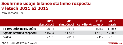 Na celý letošní rok je schválen rozpočet se schodkem 112 miliard korun. Sobotka i ministr financí Andrej Babiš (ANO) již ale uvedli, že schodek bude zhruba 90 miliard korun. "Pro rok 2014 říká zákon o státním rozpočtu schodek 112 miliard, nyní jsme na 90 miliardách a udělám maximum pro to, aby byl schodek blízko 80 miliardám korun," uvedl ministr financí.