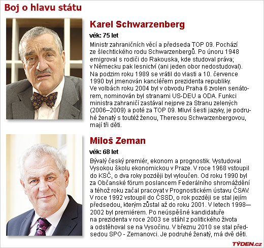 Křeslo prezidenta nemá Karel Schwarzenberg zatím vůbec jisté. Utká se o něj ve druhém kole voleb 25. a 26. ledna s expremiérem Milošem Zemanem. Ani ten však nemá rodinné zázemí, jak by se od kandidáta na prezidenta slušelo. Jeho choť Ivana se dosud médiím spíše vyhýbala a Zemana doprovázela jeho dcera Kateřina.