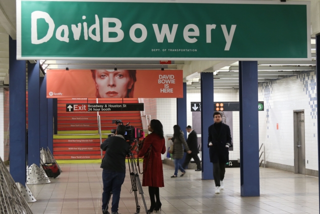 Stanice newyorského metra Broadway-Lafayette v jižní části Manhattanu poskytla své prostory pro výstavu věnovanou zpěvákovi Davidu Bowiemu, který tuto část velkoměsta dlouho považoval za svůj domov.