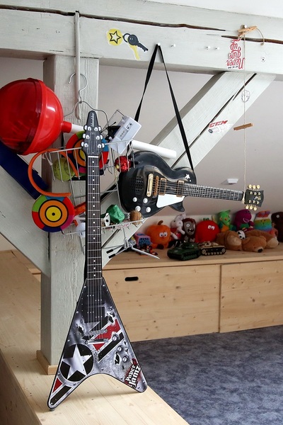 Kytary a další hudební nástroje jsou opravdu všude.