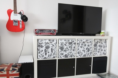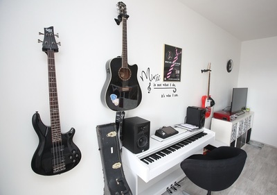 Na první pohled je vidět, že v bytě žije muzikant.