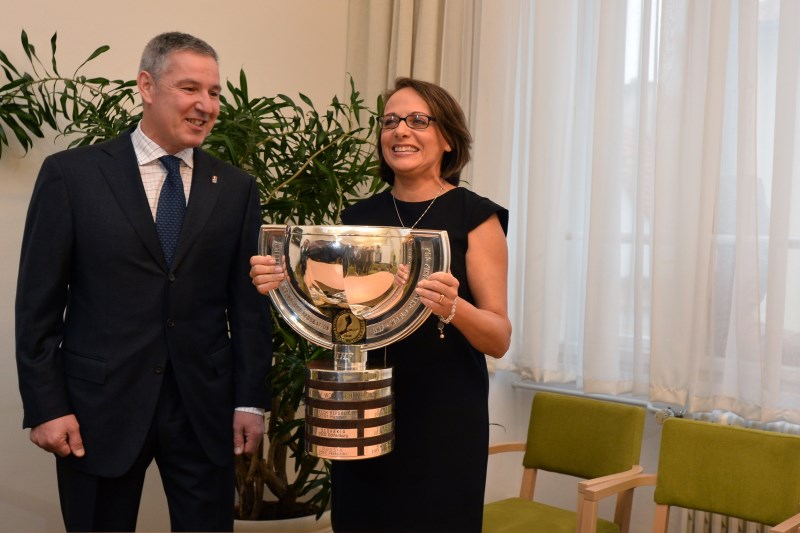 Pražská primátorka Adriana Krnáčová ve středu symbolicky převzala pohár pro hokejové mistry světa. Ten bude nyní tři týdny přímo v budově magistrátu hlavního města Prahy, pak se přesune do druhého pořadatelského města letošního světového šampionátu Ostravy. Primátorka však věří, že zásluhou úspěšných hokejistů zůstane v držení České republiky i po finálové bitvě, která je na programu 17. května.
