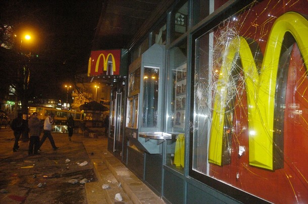 Řádící dav vyplenil tři restaurace rychlého občerstvení McDonald's a několik obchodů v Brankově ulici. Ušetřeno nezůstalo ani pět policejních vozidel či dva místní televizní štáby.