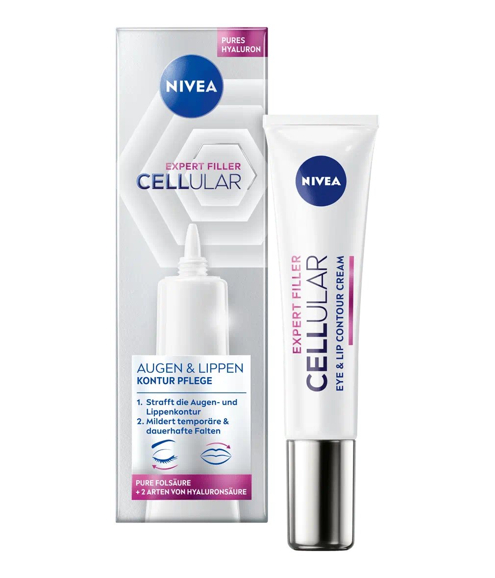Nivea Krém na kontury očí a rtů Cellular Expert Filler efektivně zpevňuje, hydratuje a vyplňuje statické i mimické vrásky. Díky účinkům čisté kyseliny listové a dvojí kyseliny hyaluronové (mikro a makro) zaznamenáte efekt vyplnění pleti kolem očí a rtů již za 24 hodin. Krém je šetrný i k citlivé pleti, je bez parfemace, aby nedráždil oči, a má dermatologické i oftalmologické schválení.