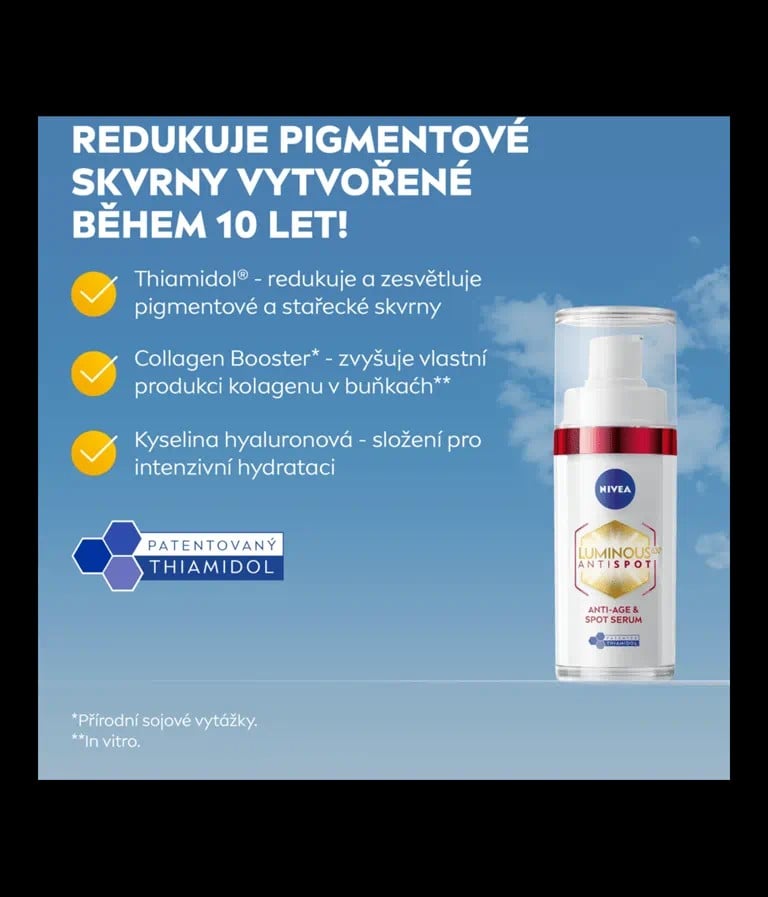 Vidíte na své pleti známky stárnutí a pigmentové skvrny? Nivea® omlazující sérum proti pigmentovým skvrnám Luminous630® s vysoce účinnou patentovanou látkou Thiamidol® redukuje nepoddajné pigmentové skvrny vytvořené během 10 let s prvními viditelnými výsledky již za 7 dní.
