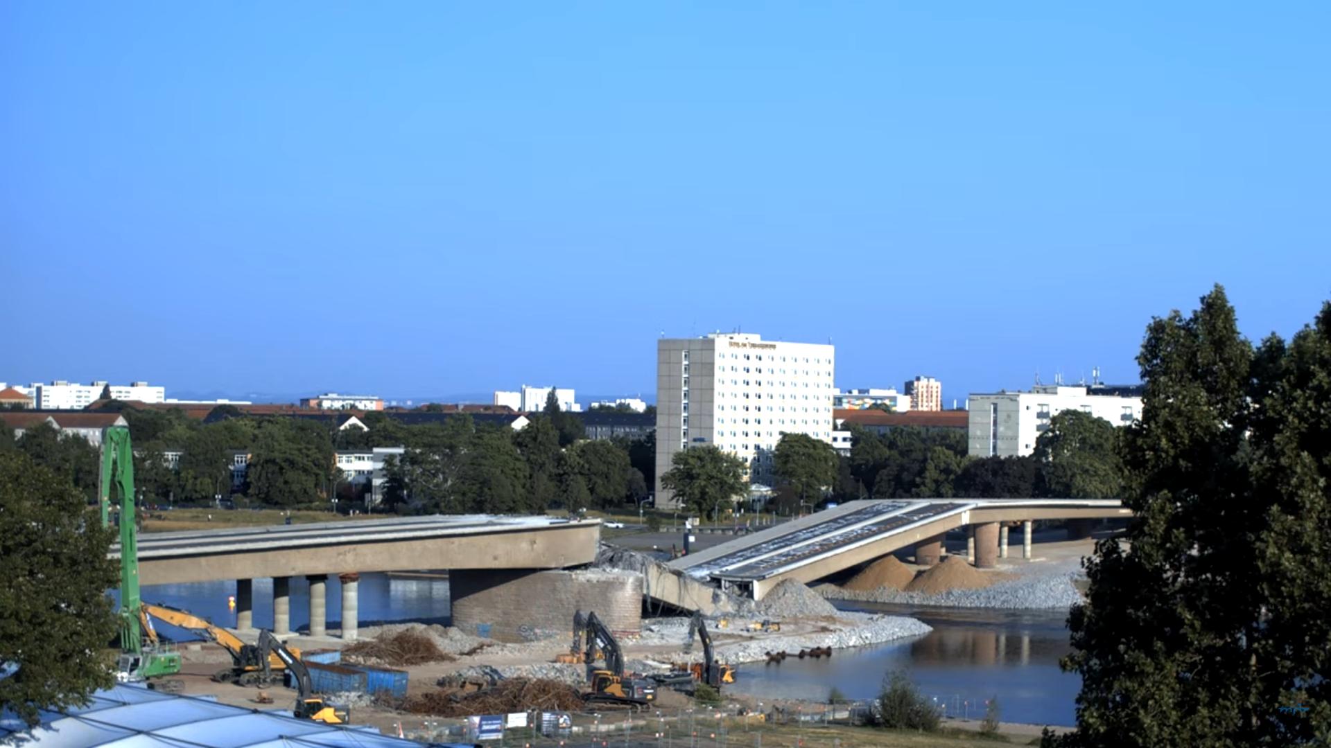 Trosky části C byly už v květnu odstraněny. Drážďanská radnice původně doufala, že by se mohly části A a B zachovat, pak ale na základě statického posudku rozhodla i o jejich demolici. Po týdnu přípravných prací se dnes dva demoliční stroje zakously do části mostu A. Už po několika hodinách se mostní konstrukce kontrolovaně zřítila. Pod mostem byl kvůli tomu připravený násep z 13.000 tun suti, který padající trosky zachytil. Po části A bude následovat demolice části B.