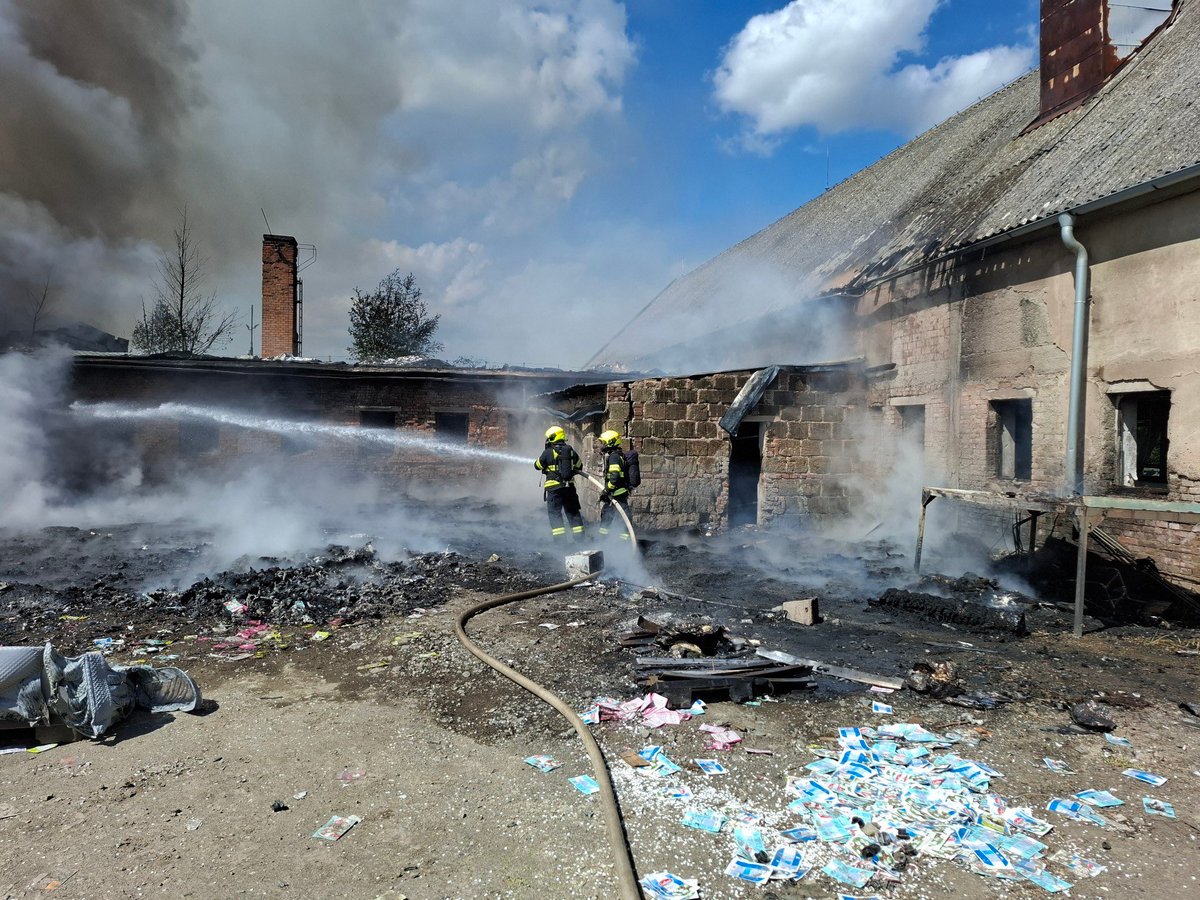 Oheň se rozšířil v prostoru areálu s halami, který je umístěn na okraji obce. "Jde o objekt firmy, která zpracovává plast a dřevoodpad, oheň zasáhl větší část haly o rozloze 15 krát 50 metrů, poškozen je i plášť objektu, uvnitř hoří plast," uvedl mluvčí.