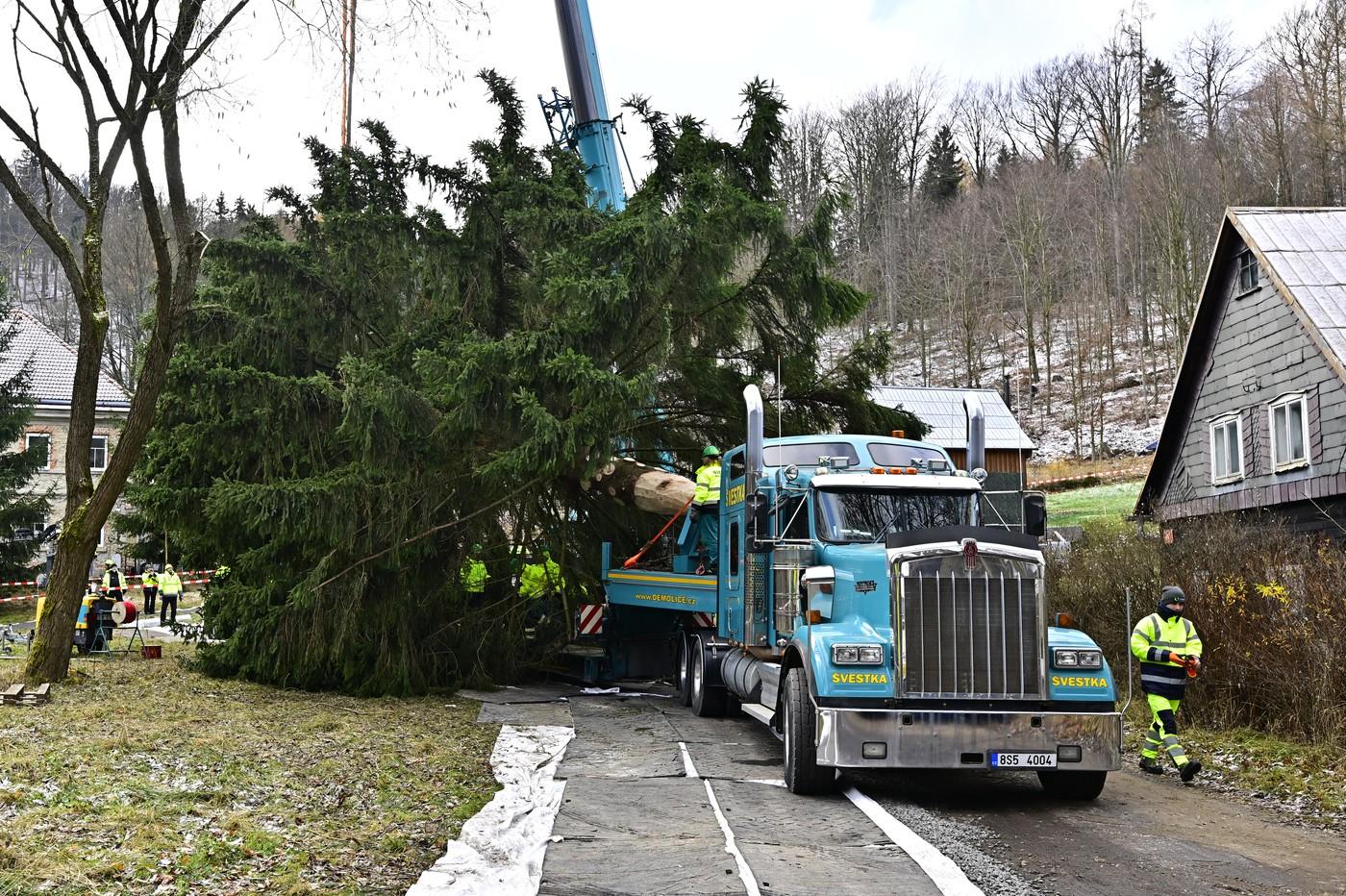 Větve museli pracovníci opatrně jednu po druhé přivázat, aby se po cestě do hlavního města nepolámaly. Na náročné práci se podílelo přes 60 lidí. Na trasu dlouhou 140 kilometrů se vánoční strom vydal až večer. Dnes dorazí do logistického areálu na kraji Prahy, kde počká do půlnoci z pondělí na úterý. Poté vyjede směr Staroměstské náměstí. Tam ho v úterý brzy ráno ukotví, upevní lany a následovat bude zdobení.